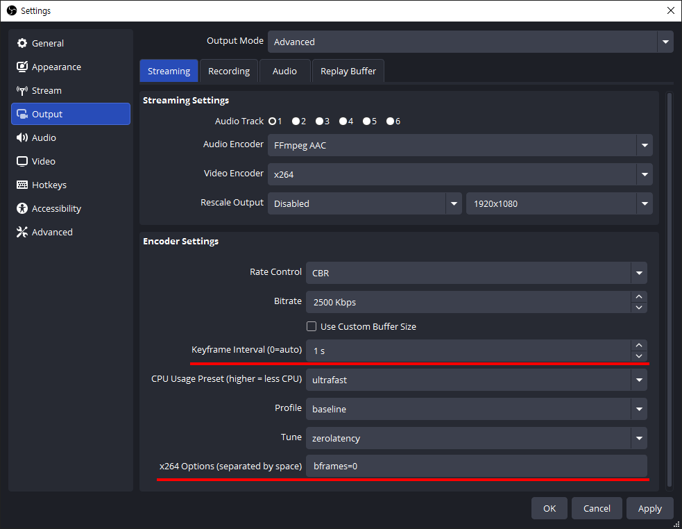 6. Next, in the <mark style="color:yellow;">\[Output]</mark> tab, we recommend setting the <mark style="color:$primary;">**`Keyframe Interval`**</mark> to <mark style="color:$primary;">**1-second**</mark> and <mark style="color:$primary;">**`B-frames`**</mark> to <mark style="color:$primary;">**0**</mark> for smooth sub-second latency and low-latency streaming.