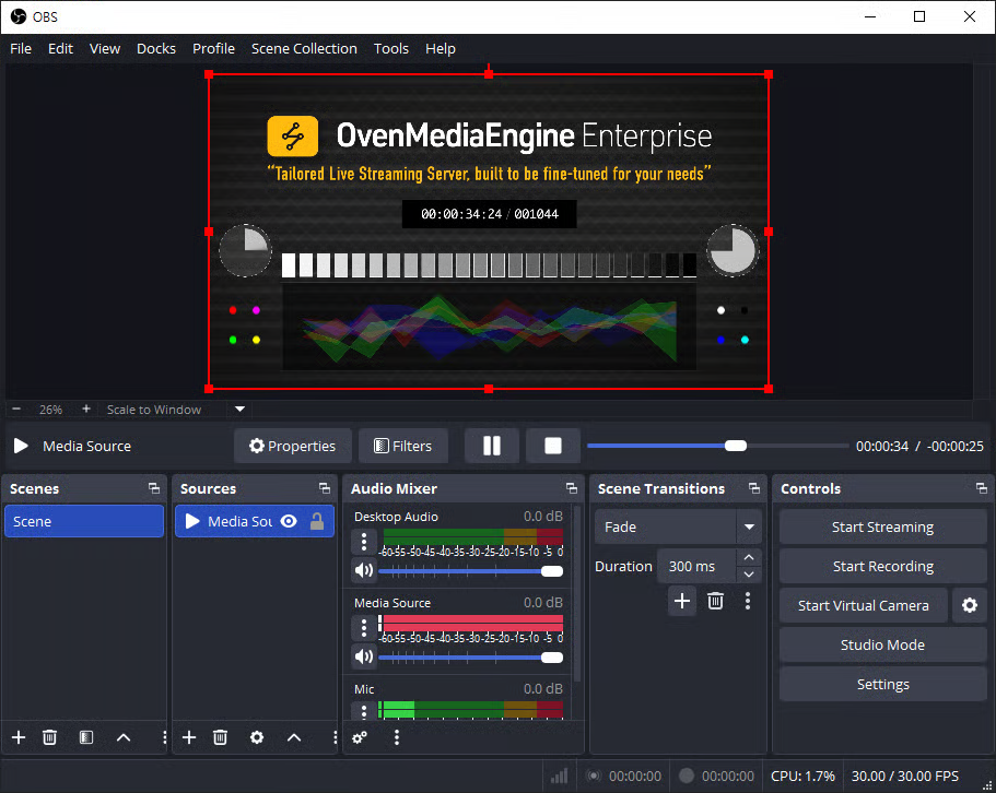 In this example, we use OBS Studio (Option A), one of the most commonly used live encoder software, and the OvenPlayer Demo provided by OvenMedia Labs (Option B).