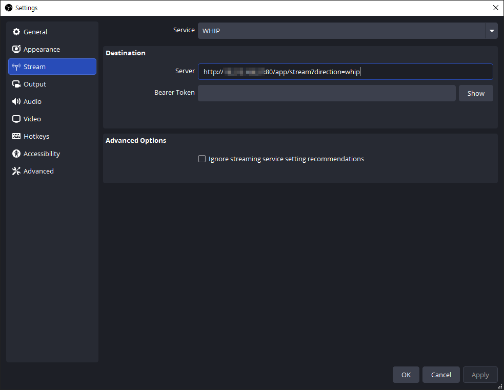 5. Under <mark style="color:yellow;">\[Service]</mark>, select <mark style="color:$primary;">**\[WHIP]**</mark>, then enter one of the WebRTC/WHIP Ingress URL patterns below in the <mark style="color:yellow;">Server</mark> field.
