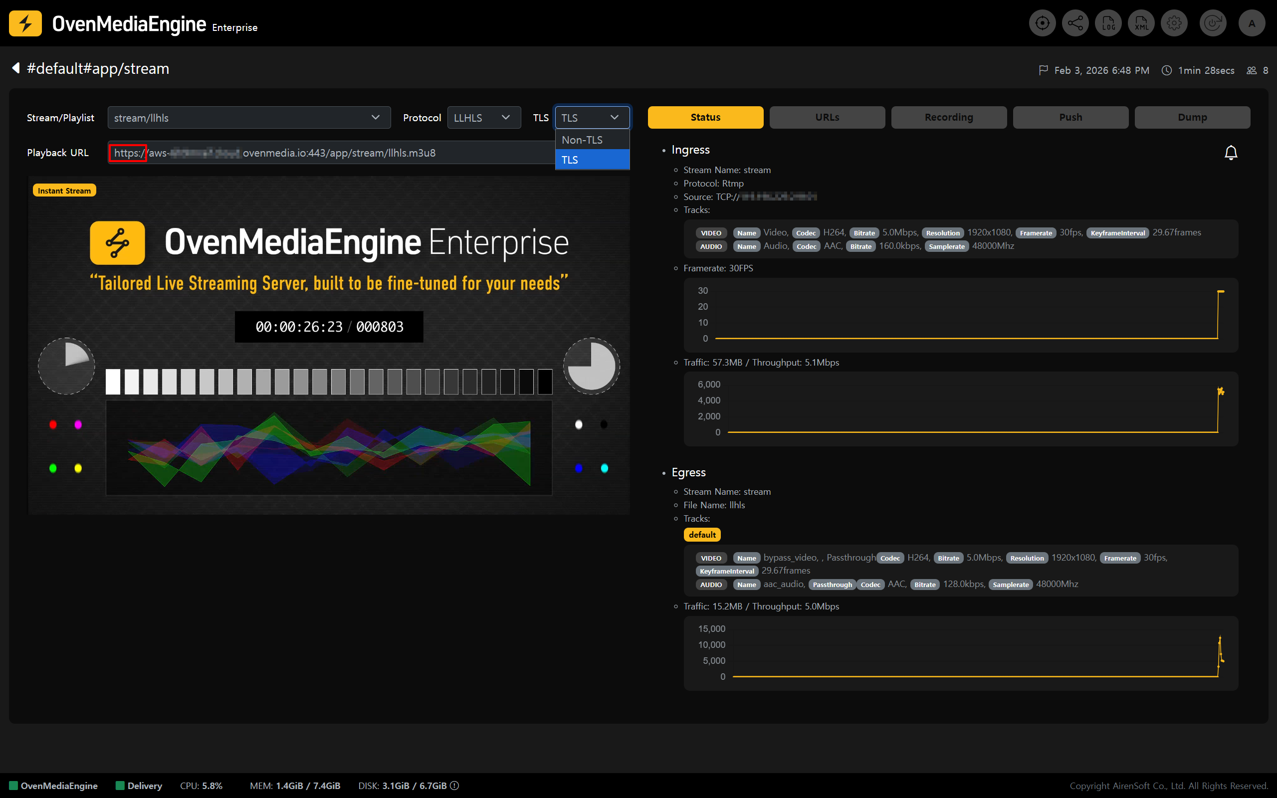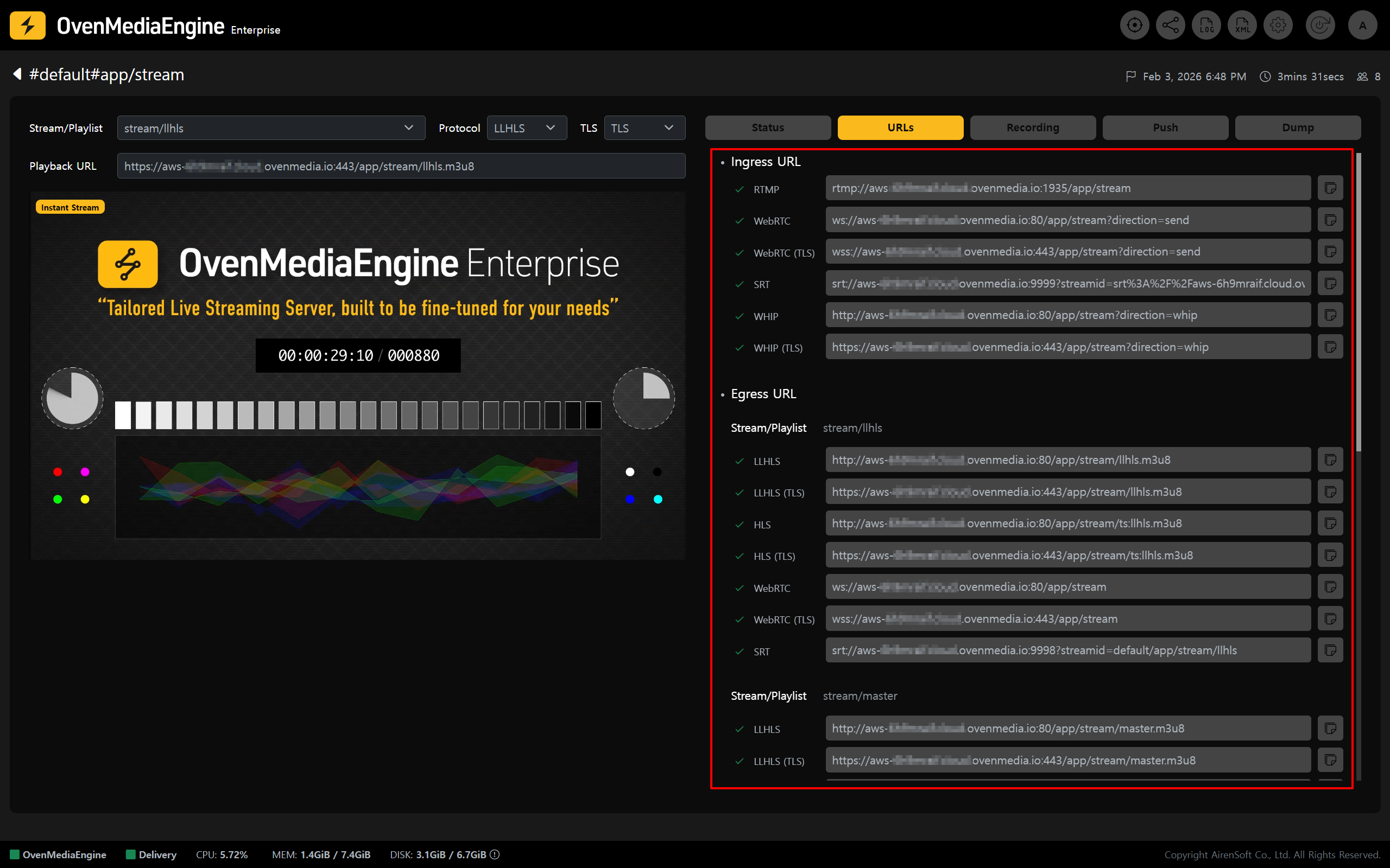 7. In the <mark style="color:yellow;">\[URLs]</mark> tab, you can view the <mark style="color:yellow;">TLS-enabled Ingress URL</mark> and <mark style="color:yellow;">Egress URL</mark> at a glance. Your service is now ready to deliver stable and secure streaming over encrypted connections.