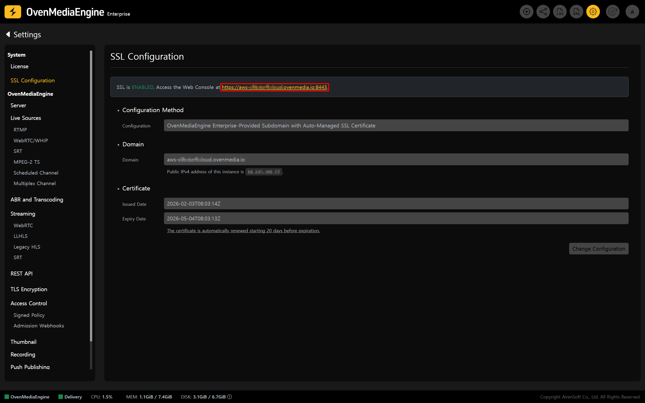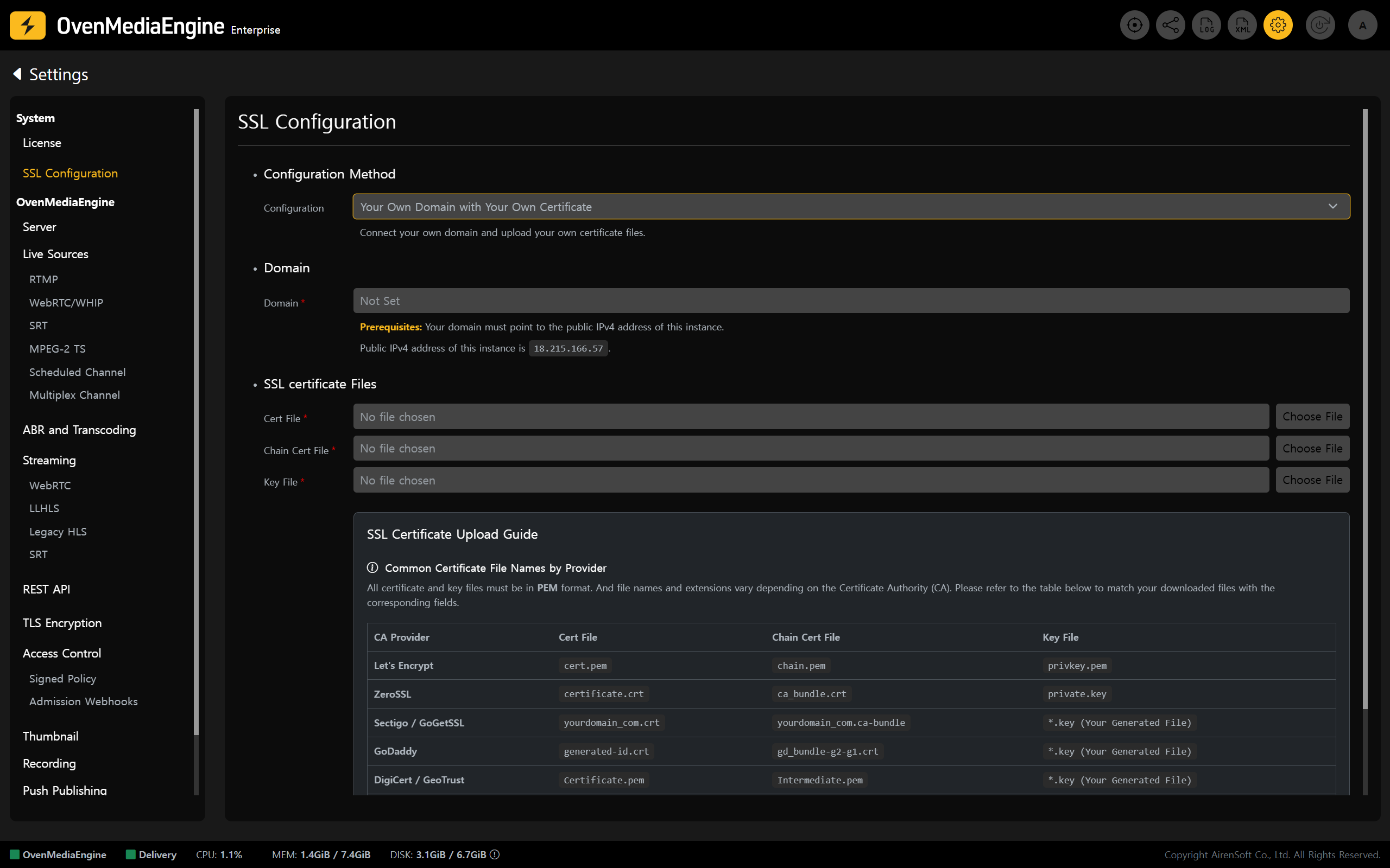 * Register your domain and SSL certificate directly in OvenMediaEngine Enterprise. With this option, the instance IP (Public IPv4 address) is shown <mark style="color:yellow;">\[SSL Configuration]</mark> page on the Web Console. To map your domain to this instance, update your domain’s DNS records in your DNS management console to point to the displayed IP.
