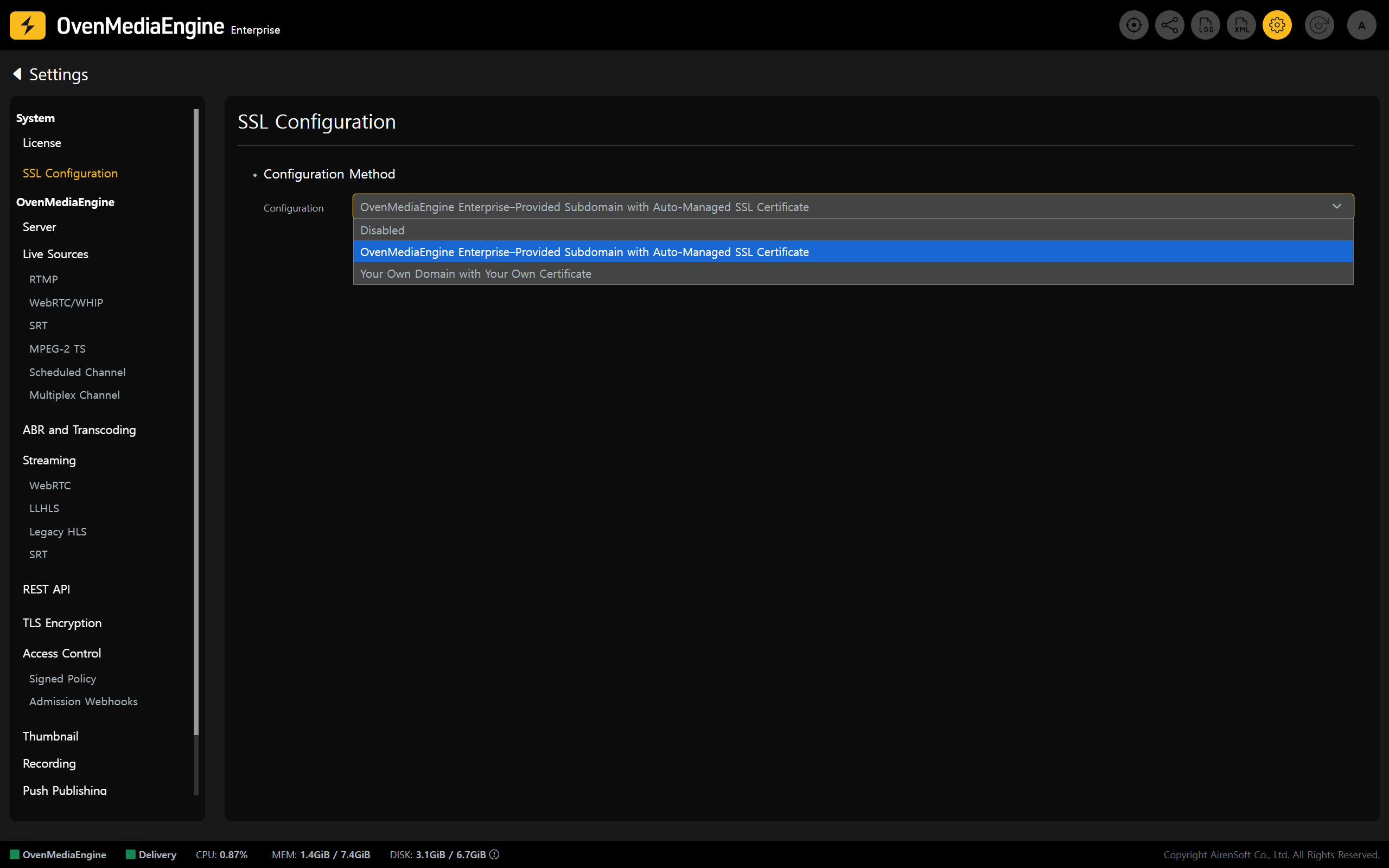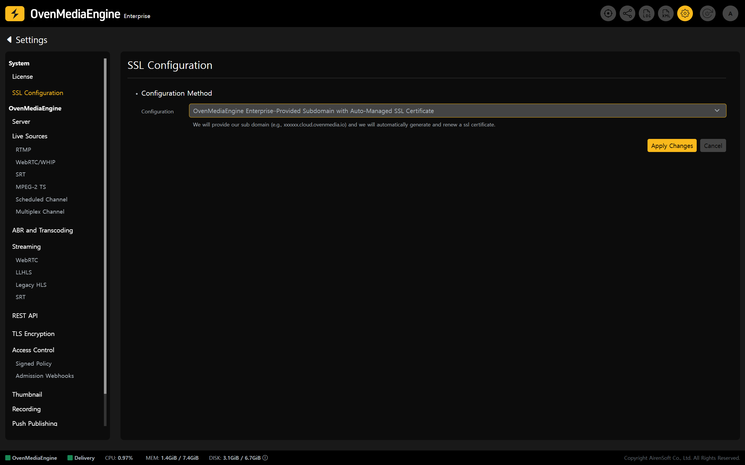 * Without any complex setup, OvenMediaEngine Enterprise <mark style="color:yellow;">automatically provisions a dedicated subdomain and SSL certificate</mark> required for SSL configuration, and <mark style="color:yellow;">manages certificate renewals starting 20 days before expiration</mark>.