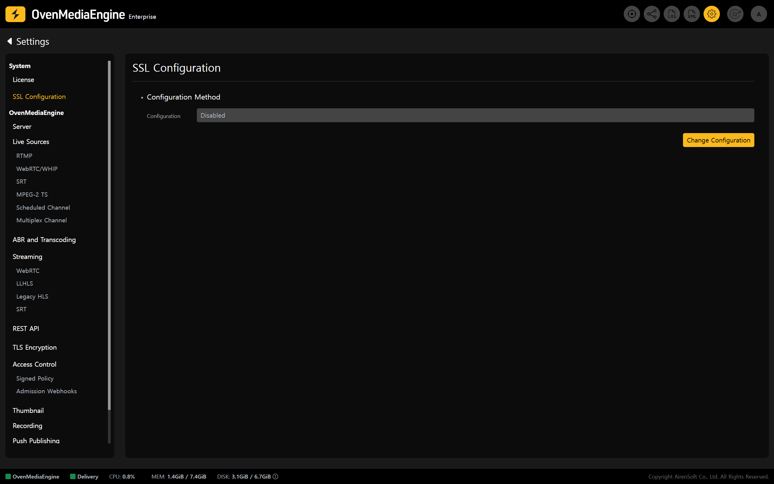 1. Click the <mark style="color:yellow;">\[Settings]</mark> icon in the upper-right corner of the Web Console to open the Settings page, then select <mark style="color:yellow;">**\[SSL Configuration]**</mark> from the left menu.