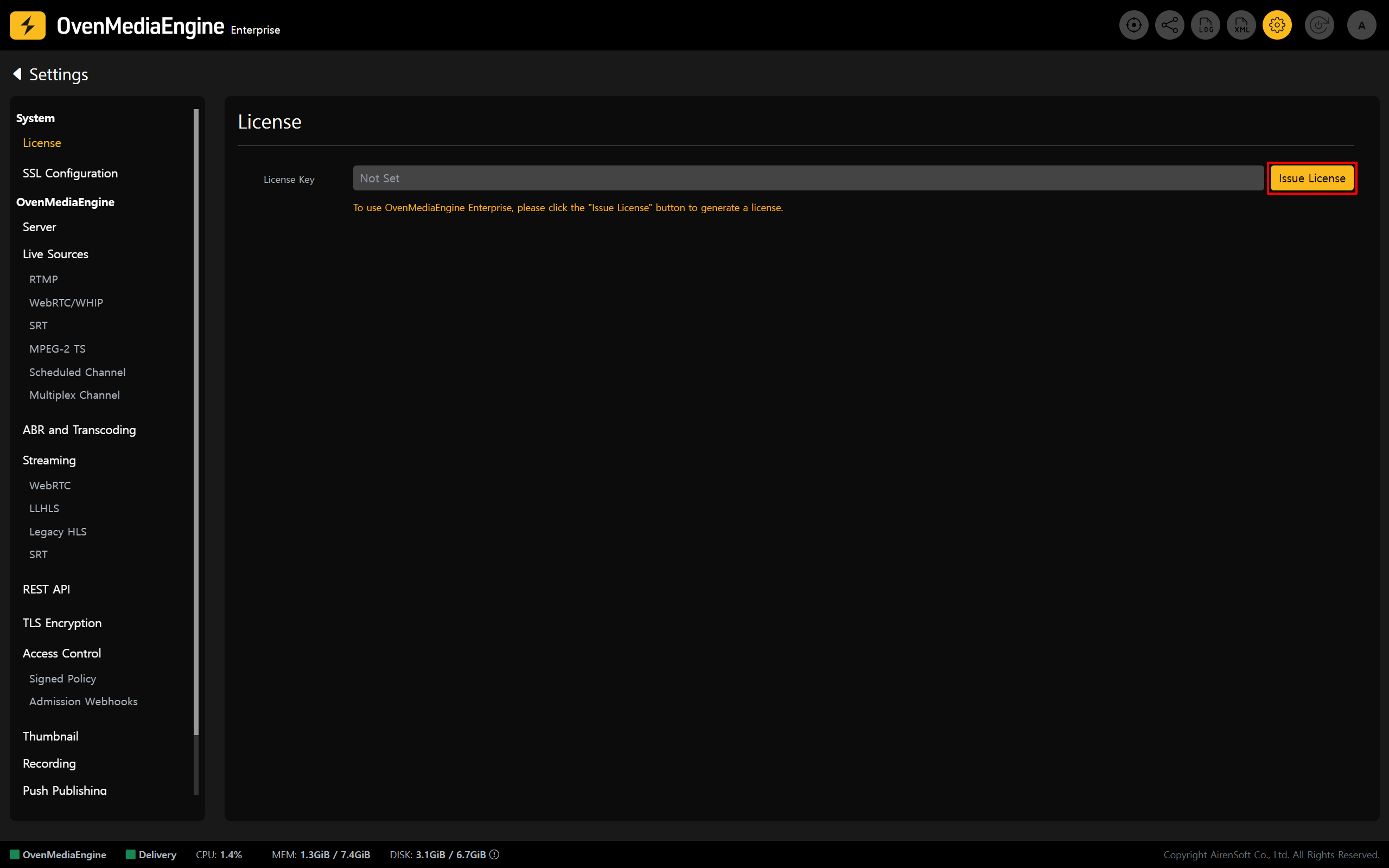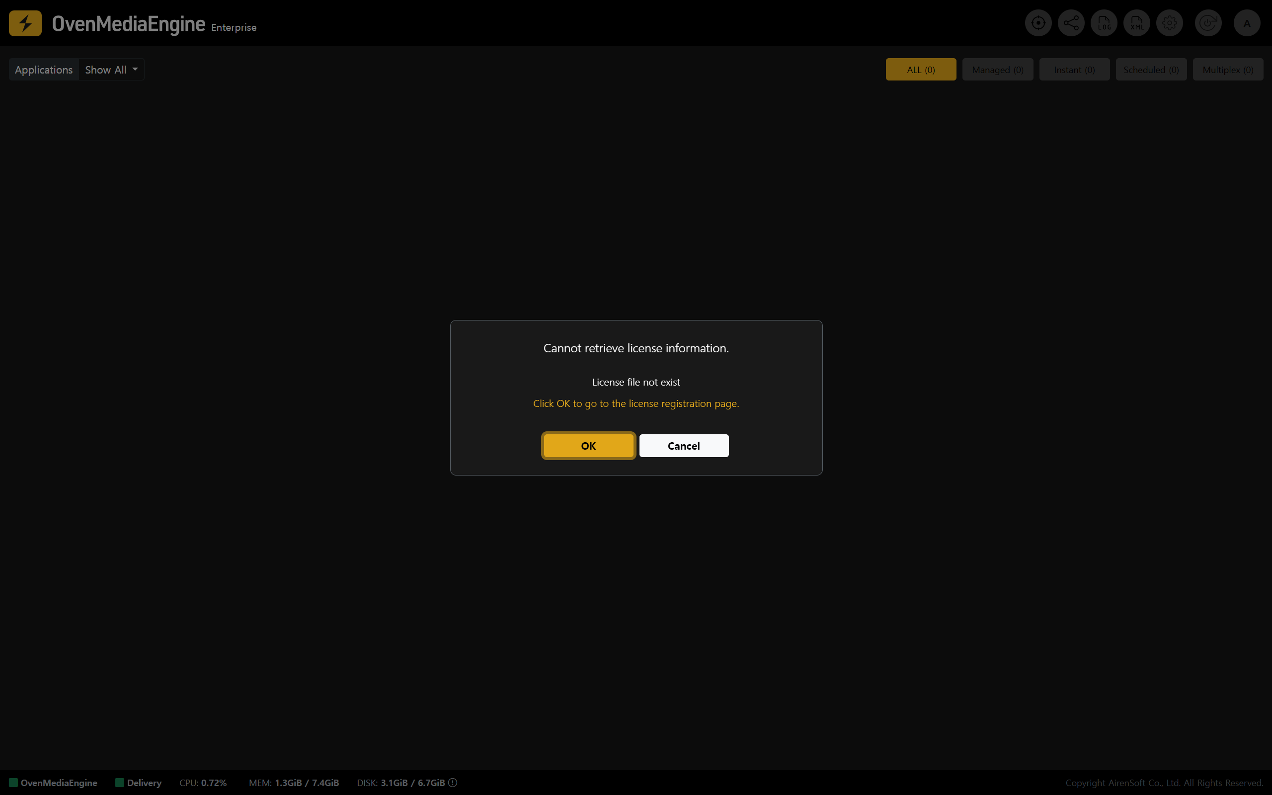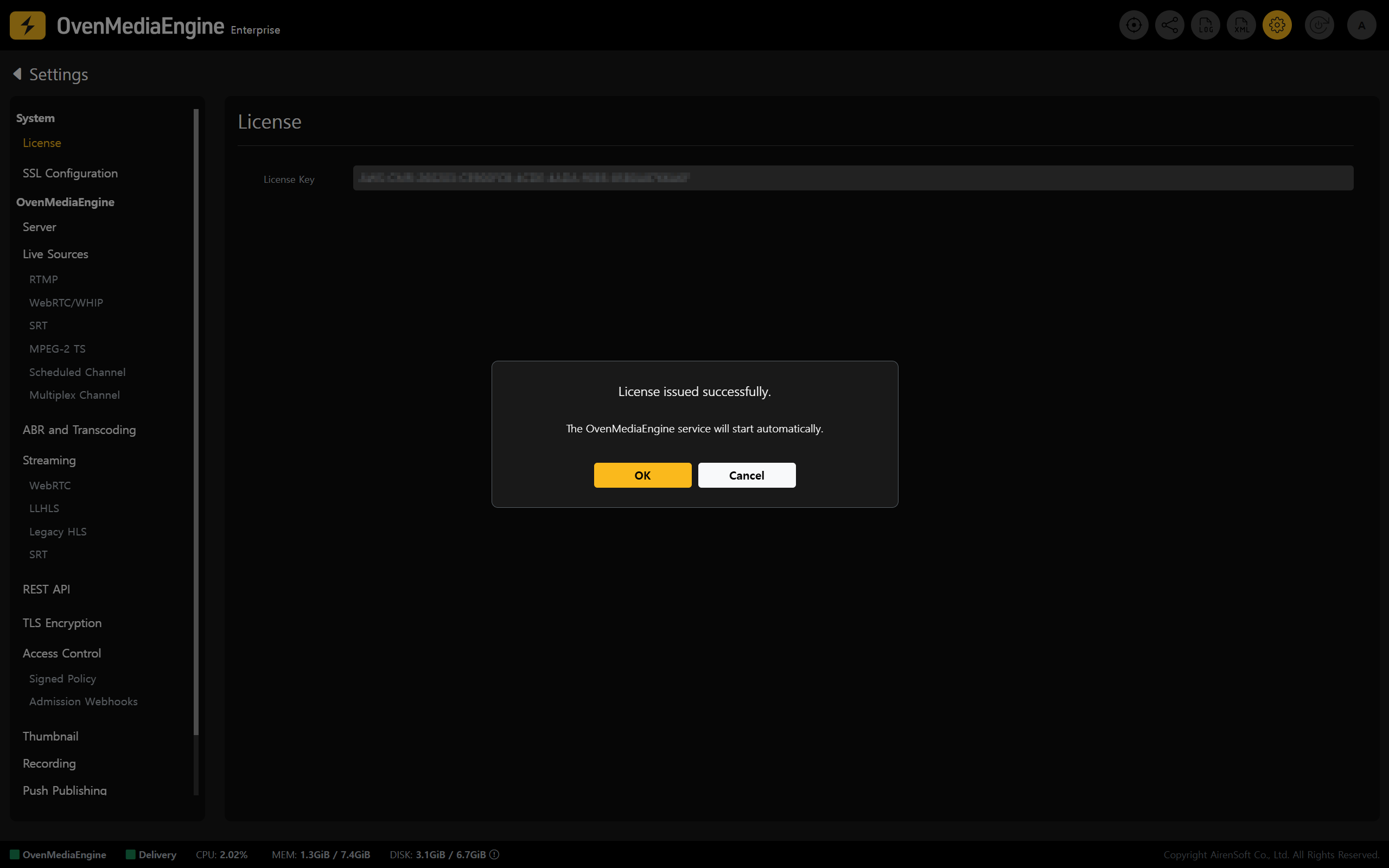 1. A **valid License Key** is required to use OvenMediaEngine Enterprise properly. Please click <mark style="color:yellow;">\[OK]</mark> in the pop-up to go to the License Settings page and reissue the License Key.