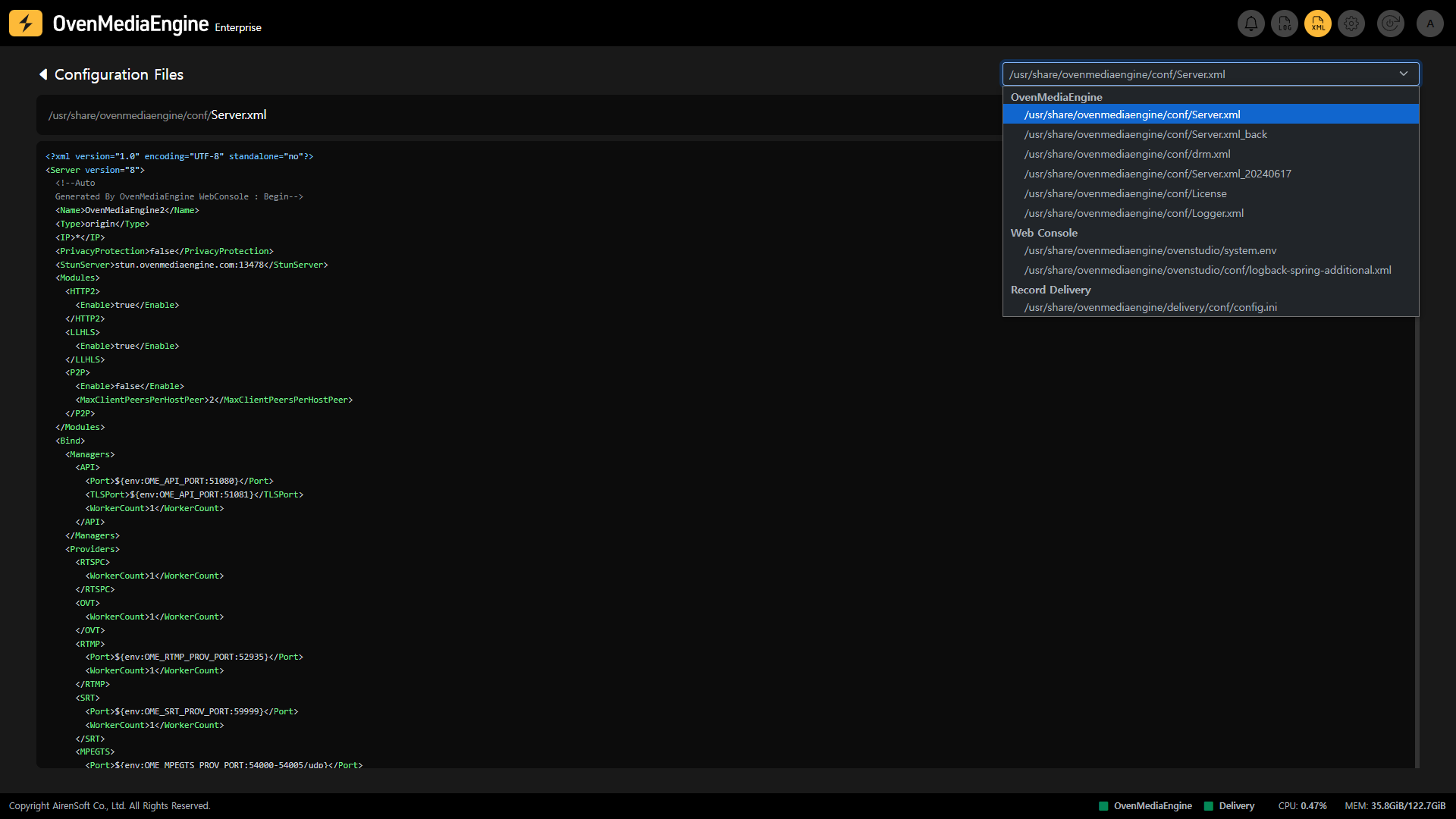 You can also view all `.XML` files in the folder where OvenMediaEngine Enterprise is installed by clicking the drop-down menu in the upper right. If OvenMediaEngine is not working as intended, you can use this feature to view the Configuration Files and, if necessary, restart the system.