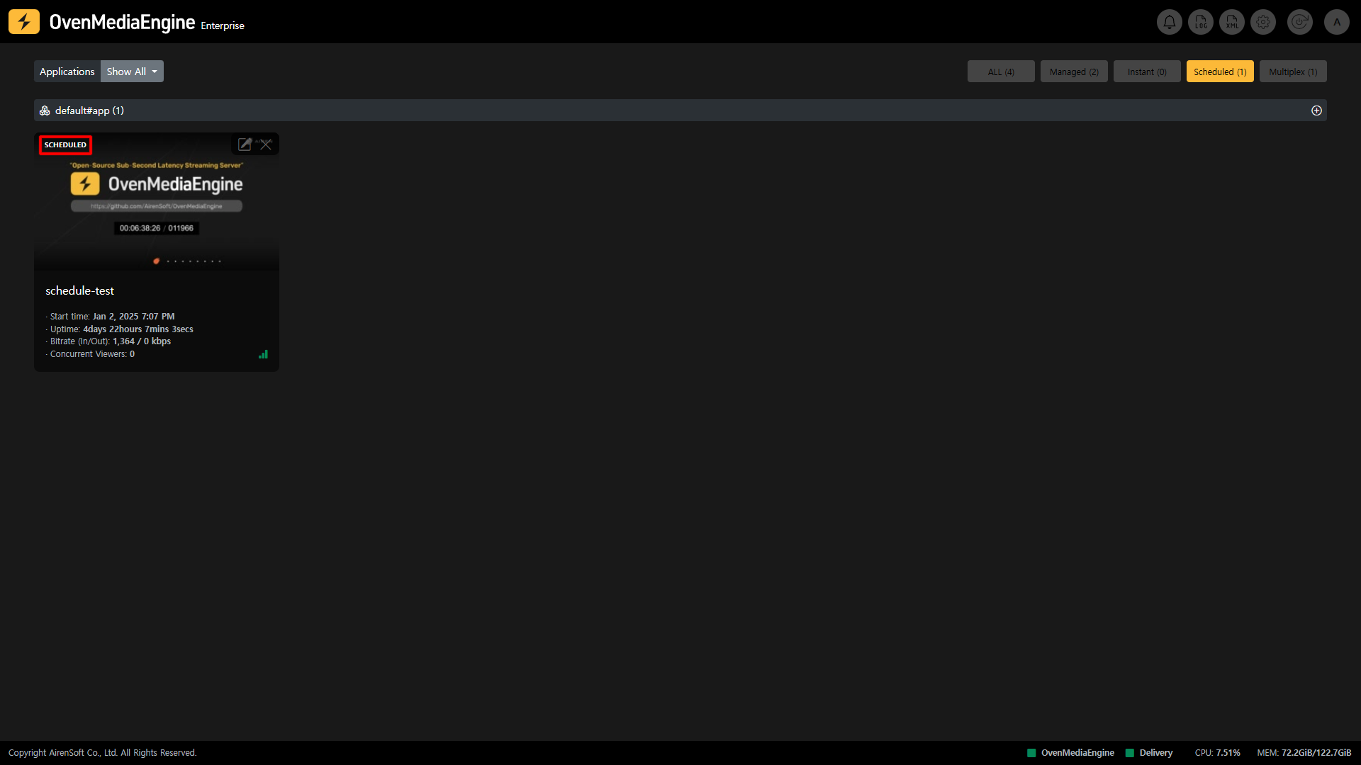 Instant Stream은 Managed Stream에 이미 지정된 Stream 외에 OvenMediaEngine Enterprise로 송출되는 Stream을 감지해 자동으로 Instant로 분류하여 모니터링 할 수 있도록 목록화하는 기능입니다. 해당 Instant Stream이 카메라, 라이브 인코더 등으로부터 송출이 중단되는 경우 Instant Streams 목록에서 자동으로 사라집니다.