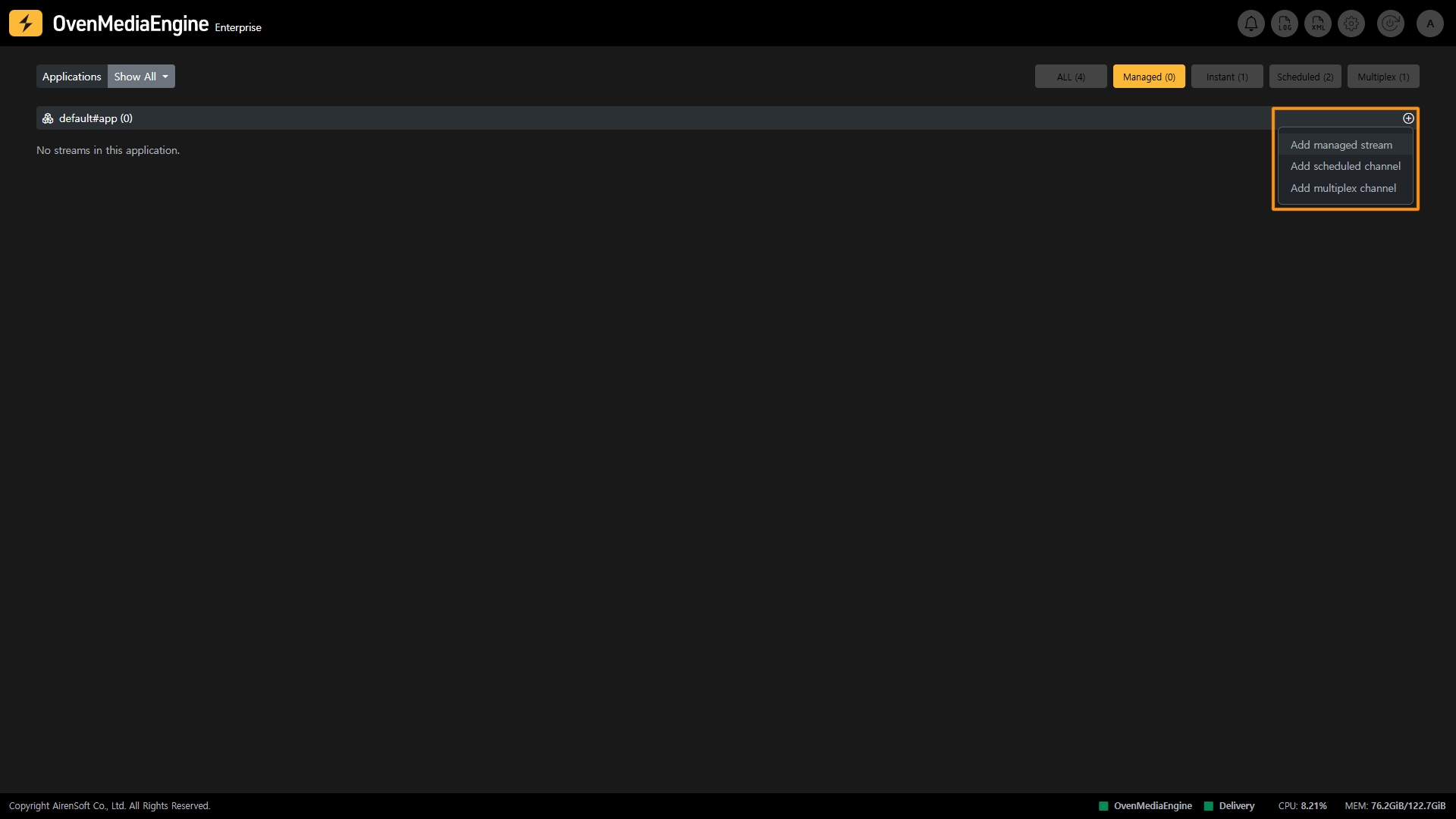 위 이미지와 같이 OvenMediaEngine Enterprise에 최초 접속 시, 생성되어 있는 Managed Stream이 없으며 우측 상단에 위치한 Plus 버튼를 클릭해 Managed Stream을 생성할 수 있습니다. Managed Stream은 사용자가 삭제하기 전까지 목록에 표시됩니다.