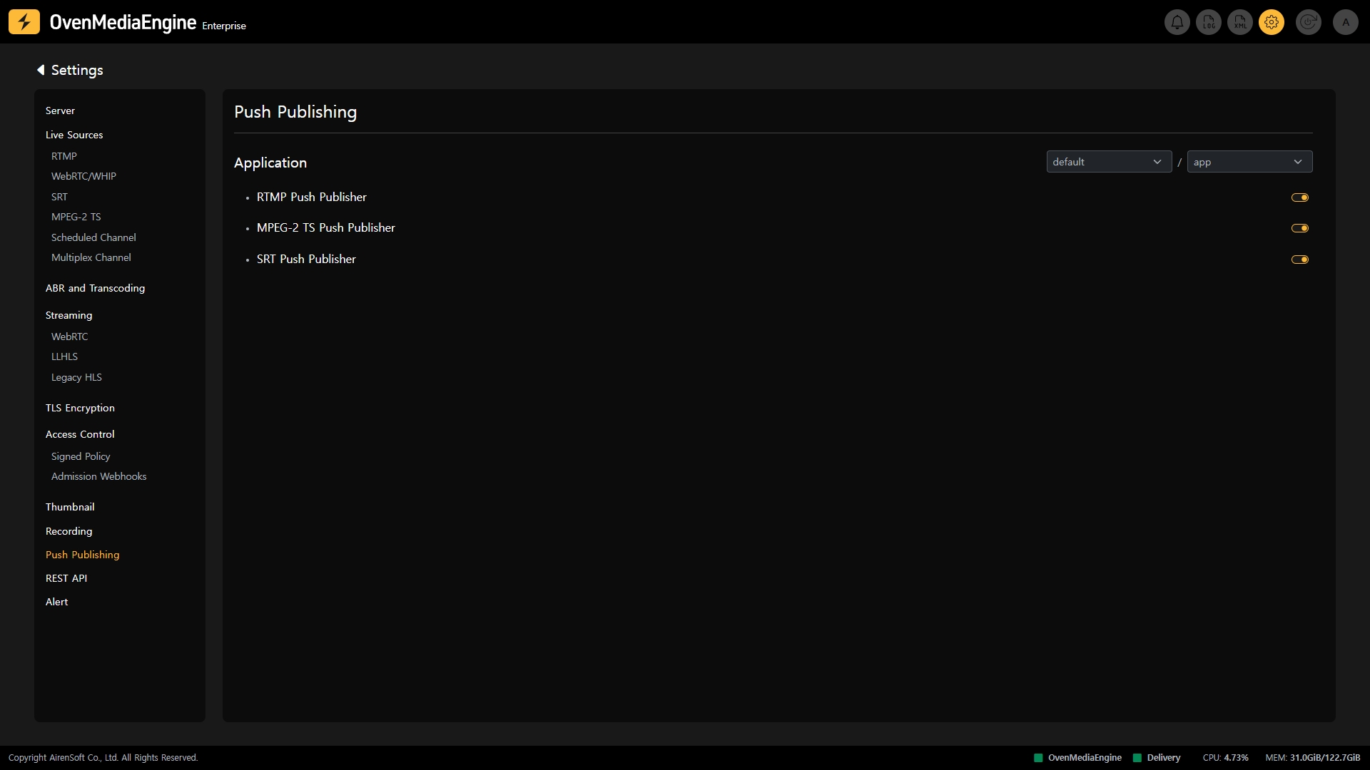 OvenMediaEngine Enterprise는 0.15.14.0-1 버전부터 SRT Push Publishing을, 0.13.0.0-1 버전부터 MPEG-2 TS Push Publishing을, 0.11.0.0-1 버전부터 RTMP Push Publishing을 제공합니다.