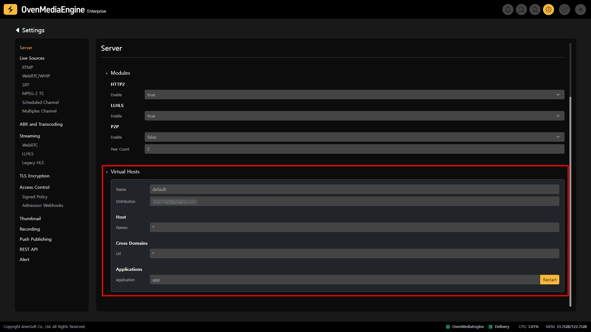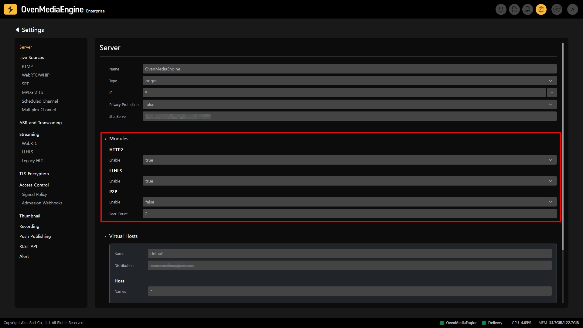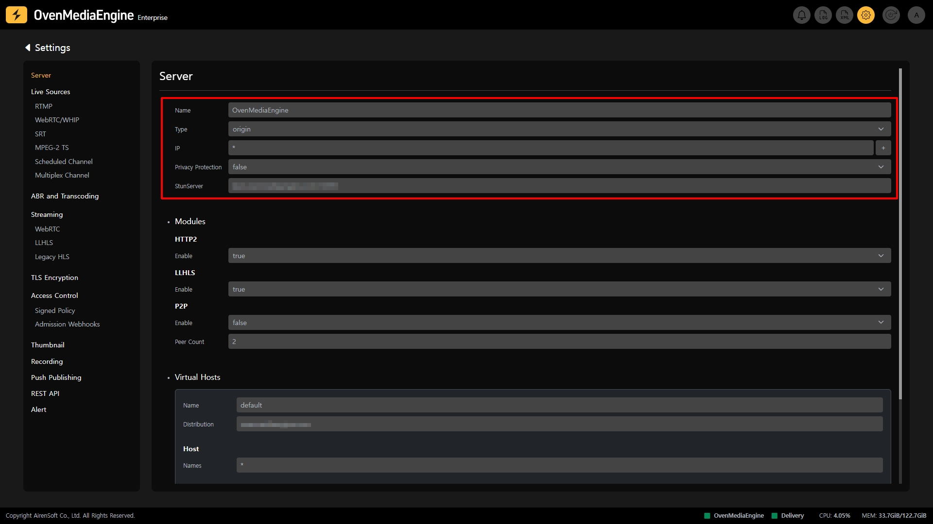 Settings 내 Server 항목에서는 OvenMediaEngine Enterprise가 참조하고 있는 OvenMediaEngine의 Server 설정 정보, 각 Module 설정 정보, Virtual Host 설정 정보 등을 확인할 수 있며, 현재 Server 명, Server 타입, Server IP, Privacy Protection, Stun Server 등을 수정할 수 있습니다. 수정된 내용은 Server.xml에 반영됩니다.